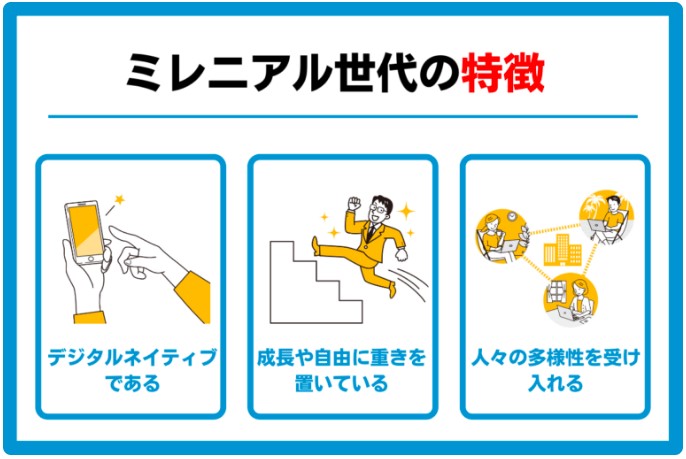 ミレニアルズ世代は、インターネットやスマートフォンの普及とともに成長し、デジタルネイティブ世代と呼ばれます。テクノロジーに慣れ親しんでいる彼らは、仕事の効率化や柔軟な働き方を求める傾向が強く、固定概念にとらわれずに自分のやり方で成果を上げたいと考えています。