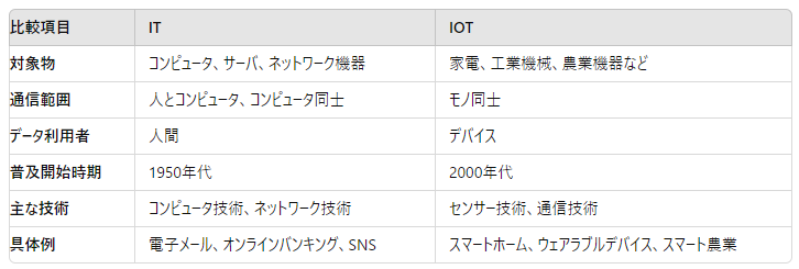 ITとIOTの違いについて、簡単にまとめると次のようになります。